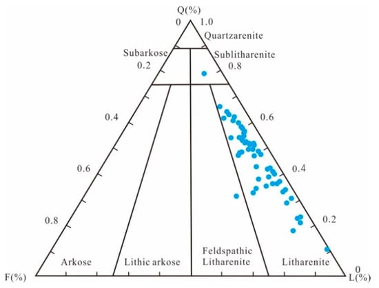 Sandstone composition of the Shanxi Formation in the Daniudi Gas Field refer to Folk, (1974) [76]. The blue dots are the data from this study.