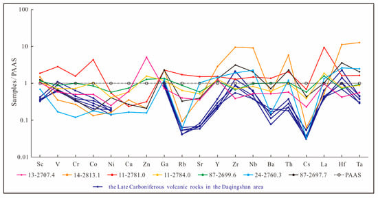 Trace elements spidergram of the investigated fine-grained sedimentary rocks normalized to PAAS following Taylor and McLennan, (1985) [81], and the data of the Late Carboniferous volcanic rocks in the Daqingshan area refers to Zhang et al., (2018) [82].