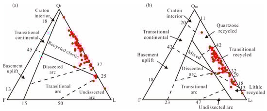 Provenance discrimination of the Shanxi Formation sandstones of the Daniudi Gas Field using the Qt-F-L (a) and Qm-F-Lt (b) diagram refer to Dickinson and Suczek, 1979 [85]. The red dots are the data from this study. Qt-Total quartzose grains, Qt = Qm + Qp; Qm-Monocrystalline quartz; Qp-Polycrystalline quartz; F-Total feldspar grains; L-Total unstable lithic fragments; Lt = L + Qp.