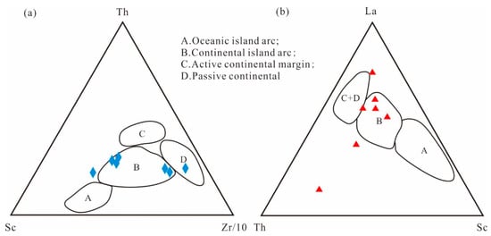 Discrimination diagrams of Th-Sc-Zr/10 (a) and La-Th-Sc (b) for the investigated fine-grained sedimentary rocks (Bhatia and Crook, 1986 [80]). Blue diamonds and red triangles are data from this study.
