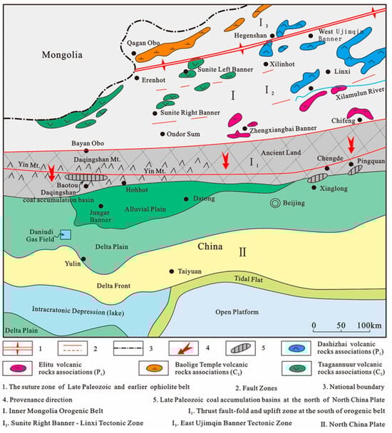 In the latest Early Carboniferous to Early Permian, the northern margin of the North China Plate developed an Andean-style active continental margin which formed a volcanic arc and back-arc basin due to the southward subduction of the Paleo-Asian Ocean (Figure 9). At the same time, the northern part of the North China Plate began to uplift (Figure 10). That resulted in volcanic materials associated with continental arc widely appearing in the Inner Mongolia Paleo-uplift. The northern uplift started to supply materials to the northern part of the Ordos Basin. Those products of volcanic eruptions accumulated in the Inner Mongolia Orogenic Belt and formed the volcanic rock associations of Baolige Temple (C2), Tsagaannuur (C2), Dashizhai (P1), and Elitu (P1), with a thickness ranging from 1900 to 2400 m (Figure 9) [95]. In the Late Permian, the Inner Mongolia Paleo-uplift evolved to become the Xing-Meng Orogenic Belt due to the continent–continent collision between the North China Plate and the Siberia Plate. With continuous subduction and compression, the Yin Mountain (Yinshan Orogenic Belt or Yin Mountain uplift) uplifted at the southern part of the orogenic belt, and the thrust fault-fold developed at the north boundary of the North China Plate (Figure 9 and Figure 10). Subduction-related magmatic activities also occurred in the Yin Mountain, which was proved by the intermediate-acid volcanogenic materials accumulation in the Daqingshan coal basin [96,97].