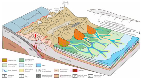 The volcanic ash layers in the Shanxi Formation, which were transported by air, could be well explained by contemporaneous volcanic activities. However, the volcanogenic components in each sub-layer of the Shanxi Formation were hard to be transported by air (Table 5). The intermittent volcanic activities and relatively short residence time in the air of volcanogenic materials could not have continuously and stably contributed to the provenance of the Shanxi Formation within 3 Ma for each sub-layer. Furthermore, the presence of coarse volcanogenic materials, such as coarse lava fragments exclusively in channels, and fine volcanogenic materials only could be found in a flood plain, implying that these materials are primarily transported by flowing water. Considering the paleocurrent directions of the Shanxi Formation in the study area, which were primarily from north to south or from northeast to southwest [102,103], the flowing water transportation also could be proved by the variation of volcanogenic component content from north to south. Taking the P1s2−2 as an example, the content of saltation and bed load rhyolite fragments and the total content of volcanogenic components tend to gradually decrease, while the content of suspended load tuffaceous matrix tends to increase from Well 28 to Well 9 to Well 22 (Table 5; Figure 10). Therefore, these volcanogenic components in the Shanxi Formation were mainly transported by flowing water of alluvial fans and braided rivers rather than by air (Figure 10).