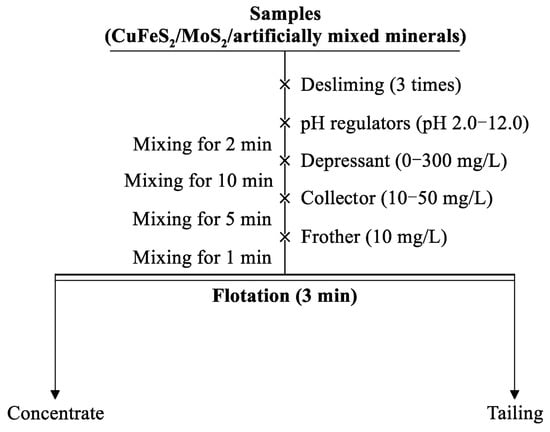 The flowsheet and conditions of flotation tests are given in Figure 2. About 2.5 g of the −74 + 38 μm size fraction of chalcopyrite was weighed on an analytical balance and placed in a 150 mL beaker. The pre-weighed amount of the mineral was mixed with 140 mL of distilled water. The mixture was placed for precisely 1 min in an ultrasonic bath (TQ-100MV). The beaker was then quickly removed from the bath and allowed to settle for 30 s. Fine fractions were then removed by decanting the suspension. This desliming procedure was repeated an additional two times until no slime was left in the suspension, with the last decanting step performed with 0.001 M KNO3 as the background electrolyte. Finally, a total of 2.0 g of chalcopyrite was obtained from the desliming process. Then, the deslimed chalcopyrite was first conditioned with 50 mL of a 0.001 M KNO3 solution for about 2 min, and the pH was adjusted to reach the experimental setting. After the measurement of pulp pH and Eh, a suitable amount of the depressant stock solution was added to the mixture, and the entire suspension was conditioned for a further 10 min. Afterward, an aliquot of a stock xanthate solution (1.0 g/L) or kerosene was added to achieve a specific final collector concentration (10 mg/L), and the mixture was allowed to condition for another 5 min. As described above, the standard reagent injection order was depressant first, followed by xanthate. The suspension was then transferred into a Hallimond tube and allowed 3 min flotation while nitrogen was passed through during the experiments. The concentrate and tailing were collected separately and weighed after drying. In the case of the artificial-mixed-ore test, the mass ratio of chalcopyrite and molybdenite was 3:1, with a total feed amount of 2.0 g, and the other conditions were the same as in the single-mineral flotation test.