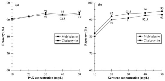 The effect of (a) PAX and (b) kerosene dosage on chalcopyrite and molybdenite flotation.