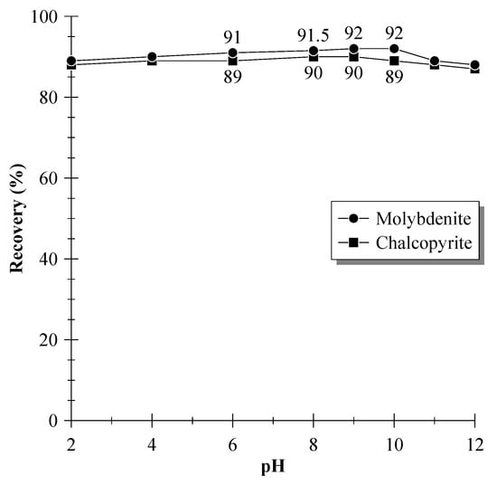 The effect of solution pH on the floatability of chalcopyrite and molybdenite was tested under the fixed conditions of 20 mg/L kerosene, 10 mg/L MIBC, and a flotation time of 3 min, and the results are given in Figure 4. It can be seen that both chalcopyrite and molybdenite showed good floatability within a wide pH range between 2.0 and 12.0. The recoveries of chalcopyrite and molybdenite reached almost 90% and then decreased at pH greater than 10.0. The chalcopyrite and molybdenite recoveries were 89% and 92%, with the pulp pH set at 10.0; therefore, it was applied as the optimal condition in the subsequent experiments.