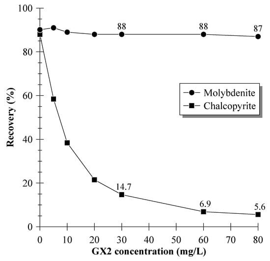 The floatability of chalcopyrite and molybdenite as a function of GX2 dosage.