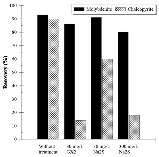 In order to further verify the separation effect of GX2 on chalcopyrite and molybdenite, a flotation test of artificially mixed ore (chalcopyrite-to-molybdenite mass ratio of 3:2) was conducted under the conditions of GX2 dosages of 0–80 mg/L or Na2S dosages of 30 and 300 mg/L, 20 mg/L kerosene, 10 mg/L MIBC, pH 10.0, and a flotation time of 3 min, and the results are shown in Figure 6. As can be seen in Figure 6, the recoveries of chalcopyrite and molybdenite is about 90% without adding a depressant (GX2), which is consistent with the results of the single-mineral flotation test. However, chalcopyrite recovery rapidly drops to below 5% when increasing the GX2 dosage to 60 mg/L. In comparison, the molybdenite recovery remains over 90%, indicating that GX2 can strongly depress chalcopyrite but does not affect molybdenite anymore; i.e., it has excellent selectivity for separating molybdenite from chalcopyrite. Compared with the Na2S baseline (see Figure 7), the recoveries of molybdenite and chalcopyrite were 10% and 90%, respectively, using 30 mg/L GX2; however, these values were 60% and 90%, respectively, when using 30 mg/L Na2S. The chalcopyrite and molybdenite recoveries were 20% and 80%, respectively, when increasing the Na2S dosage to 300 mg/L, which is similar to the result obtained at 30 mg/L GX2. The results indicate that GX2 is a more powerful depressant compared with the baseline of Na2S.