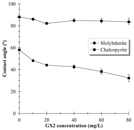 The contact angles of chalcopyrite and molybdenite after being treated with various GX2 dosages.