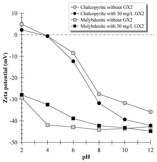 Zeta potentials of chalcopyrite and molybdenite with and without GX2 in pH range of 2.0–10.0.