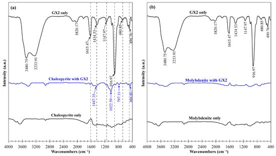 Infrared spectra of GX2 and minerals ((a) chalcopyrite and (b) molybdenite) before and after treatment with GX2 at pH 1.0.
