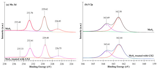 High-resolution (a) Mo 3d and (b) S 2p XPS spectra of GX2 and untreated and treated molybdenite.