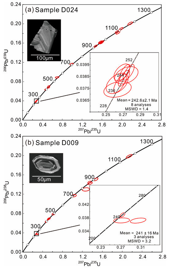 The zircons in sample D009 exhibit smaller and more rounded characteristics, with an average crystal length of 50 μm and length-to-width ratios ranging from 1:1 to 2:1 (Figure 4b). The analyzed zircon grains show highly variable U (58–869 ppm) and Th (70–584 ppm) contents, with Th/U ratios ranging from 0.3 to 1.2 (Table S3). Among the fourteen grains from D009, the youngest three zircon grains were dated at 236.3 ± 3.1 Ma, 236.6 ± 3.1 Ma, and 246.9 ± 2.7 Ma, yielding a mean age of 241 ± 16 Ma (n = 3, MSWD = 3.2). Furthermore, another eleven spot analyses yielded older ages ranging from 1200 to 400 Ma, of which ~420 Ma are relatively concentrated.