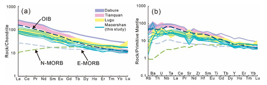 (a) Chondrite-normalized rare earth elements diagram of Maoershan mafic rocks. (b) Primitive-mantle-normalized trace elements diagram of Maoershan mafic rocks. Normalization values of chondrite, primitive mantle, N-MORB, E-MORB, and OIB are from [51]. Data for Dabure and Tianquan oceanic islands are from [21]; data from the Lugu seamount are from [22].