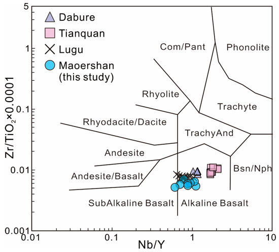 Major and trace element data of the Maoershan mafic rocks are provided in Table S4. These mafic rocks have undergone calcite alteration and lower greenschist facies metamorphism, resulting in a range of loss-on-ignition values and alterations in the concentrations of mobile elements compared with their original protolith contents. The loss-on-ignition values for these mafic rocks range from 1.39 to 7.49 wt.%, with an average of 4.14 wt.%. The reported weight percentages of major element data as oxides were recalculated to 100%. The concentrations and ratios of immobile elements (e.g., the rare earth elements and high-field-strength elements) and transition metals (e.g., V, Ni, Cr) were not affected by these processes [47] and can be used to classify and determine the samples’ petrogenesis and tectonic settings.