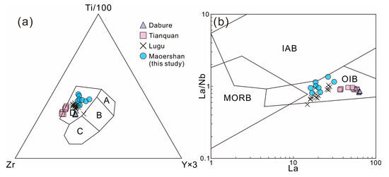 Most of the Maoershan basalt and diabase samples are classified as alkaline basalt on the Zr/TiO2 vs. Nb/Y immobile element classification diagram (Figure 6), with one sample, D025-1, plotted in the subalkaline basalt area. All samples fall within the intraplate basalt field on the Ti/100 vs. Zr vs. (Y × 3) diagram (Figure 7a), as well as in the ocean island basalt field on the La/Nb vs. La diagram (Figure 7b), indicating that they originated from OIB-type magmas.