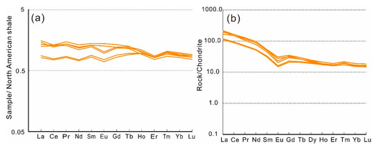 (a) NASC- and (b) chondrite-normalized REE patterns of Maoershan siliceous rocks (normalization values of North American shale are from [55]; normalization values of chondrite are from [51]).