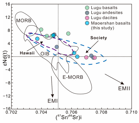 The Sr-Nd isotopes of the Maoershan basaltic rocks are similar to those of Lugu oceanic island lavas [22], exhibiting an EMII-type enrichment trend (Figure 9) and implying that the Maoershan basaltic rocks originated from a mantle source similar to that of modern Hawaii and Society magmas [59]. The scattered Sr-Nd isotopes may reflect the heterogeneity of the magma sources [22].
