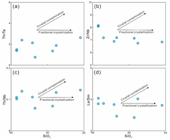 Plots of Th/Ta, Zr/Nb, Th/Nb, La/Sm vs. SiO2 diagrams of Maoershan mafic rocks. (a) Th/Ta–SiO2 diagram; (b) Zr/Nb–SiO2 diagram; (c) Th/Nb–SiO2 diagram; (d) La/Sm–SiO2 diagram.