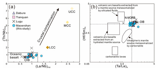 The Longmuco-Shuanghu Paleo-Tethys Ocean underwent subduction and closure as a back-arc oceanic basin during ~270–230 Ma [18,20], indicating the complexity of ocean declination. Thus, after ruling out continental crust material contamination, it was essential to ascertain whether the magma is contaminated by the subduction oceanic crust. Island arc basalts (IABs) produced by the oceanic crust subduction typically have a [Nb/Th]PM << 1 and a [Ta/U]PM << 1, while MORB and OIB exhibit a [Nb/Th]PM ≥ 1 and a [Ta/U]PM ≥ 1 [70]. The Maoershan basaltic rocks have a [Nb/Th]PM between 0.92 and 1.66 (with a mean ratio of 1.19) and [Ta/U]PM values between 0.65 and 1.45 (with a mean ratio of 0.97), suggesting that the Maoershan basaltic rocks are not contaminated by the subduction oceanic crust. This is also demonstrated in the (Ta/La)N–(Hf/Sm)N diagram, where the samples fall within the OIB area (Figure 11b), far away from the region where the mantle source is influenced by metasomatism.