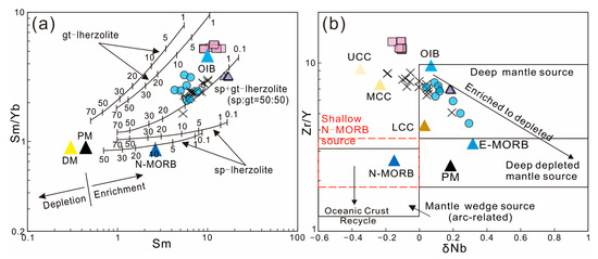 (a) Sm/Yb–Sm diagram (modified from [81]); N-MORB, OIB, and PM values are from [51], the DM (depleted MORB mantle) is from the compilation of [82]. (b) Zr/Y–δNb diagram (modified from [83]); N-MORB, OIB, E-MORB, and PM values are from [51], UCC, MCC, and LCC values are from [67].