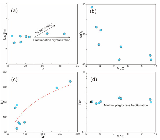 Plots of La/Sm, SiO2, Eu* vs. MgO and Ni vs. Cr diagrams of the Maoershan mafic rocks. (a) La/Sm–La diagram; (b) SiO2–MgO diagram; (c) Ni–Cr diagram; (d) Eu*–MgO diagram.