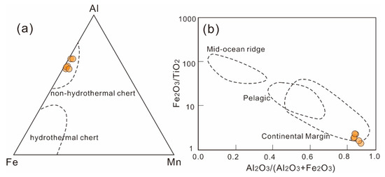 Geochemical data of cherts plotted on the (a) Al vs. Fe vs. Mn and (b) Fe2O3/TiO2 vs. Al2O3/(Al2O3 + Fe2O3) diagrams (modified from [90,91]).