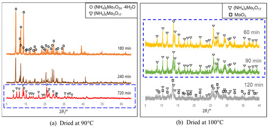 XRD analyses of APT with drying time at 90 °C and 100 °C.