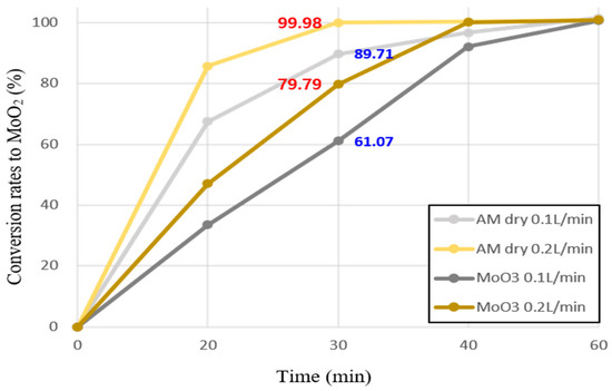 High-purity APT and MoO3 powders of reagent grade (99.9 wt%) were used in this study. The APT was dried using an ON-11E natural convection oven (Jeio Tech. Co. Ltd., Daejeon, Republic of Korea) at a temperature range of 70 to 100 °C. Then, 10 g of the sample was loaded in an alumina boat and placed in the middle of a horizontal tube furnace (ID 60 × L 1000). Ar and H2 gases were used in the self-reduction stage and in the primary reduction stage, respectively. The Ar gas flow rate was fixed at 0.3 L/min, and H2 gases at 0.1 or 0.2 L/min. The temperature was fixed at 575 °C because it was the lowest temperature in this study to achieve 100% conversion of MoO3 → MoO2, and the residence time range was from 30 to 60 min. The conversion rate was calculated by the weight loss, and the phase change and the morphology were characterized by X-ray diffraction (XRD, D/Max 2500, Rigaku, Tokyo, Japan) and by scanning electron (SEM, MIRA-3, Tescan Co., Brno, Czech Republic) at the Eco-friendly Shipbuilding Core Research Support Center, respectively.