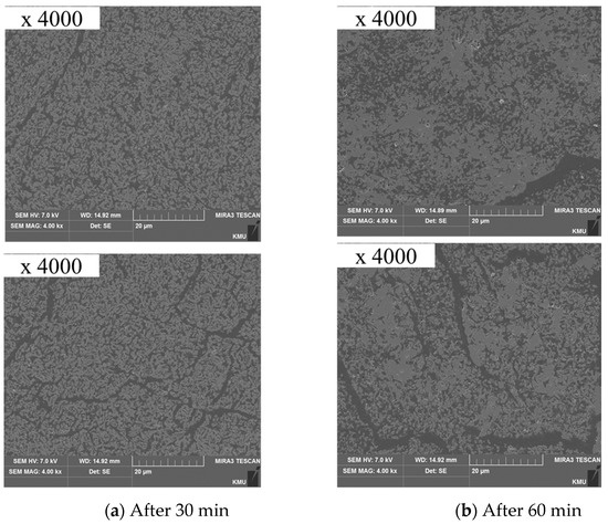 In a conventional process, (NH4)6Mo7O24·4H2O is first roasted to produce MoO3, which is then reduced by hydrogen gas in two stages: MoO3 → MoO2 and MoO2 → Mo. MoO3 is easily reduced by either hydrogen or other reducing gas, and several studies have reported morphology changes during the reduction [17,18,19,20,21]. In the process proposed in this study, (NH4)6Mo7O24·4H2O is first dried to (NH4)4Mo5O17 and then is directly reduced, without roasting, by hydrogen gas in two stages, so that the ammonia constituent in (NH4)4Mo5O17 can be utilized as a reductant in the first stage to produce MoO2. The experimental results carried out for this purpose are presented in Figure 8, Figure 9 and Figure 10. In the experiments, (NH4)4Mo5O17 was reduced by hydrogen gas of two flow rates, 0.1 L/min and 0.2 L/min at 575 °C, which is a typical temperature for the first stage, and the conversion rates of (NH4)4Mo5O17 were compared with those of MoO3. As can be seen in Figure 8 and Figure 9, the conversion rates of (NH4)4Mo5O17 were found to be higher than those of MoO3, especially in the time range of 20~30 min. By the time the conversion rate (i.e., the reduction degree) of (NH4)4Mo5O17 had reached 100%, that of MoO3 reached 80% at the hydrogen flow rate of 0.2 L/min. This phenomenon also supports the self-reduction of (NH4)4Mo5O17 by the internal ammonia. The morphology changes during the direct reduction are presented in Figure 10. As the direct reduction proceeded, the kernel shape of the ammonium molybdate transformed into platelet shapes of molybdenum oxides such as Mo4O11 and MoO2, and finally all the ammonium molybdates were changed into MoO2 of platelet shapes. This appearance agrees with the model suggested by Dang et al. for hydrogen reduction of MoO3 to MoO2 at 773 to 829 K [22]. The SEM images of the internal structure of the directly H2-reduced samples are shown in Figure 11. SEM images of that for (NH4)4Mo5O17 could not be obtained because of technical difficulties. As can be seen, as the direct reduction proceeded, more pores and cracks were observed within the internal structures. This aspect is similar to what was observed during the hydrogen reduction of MoO3 [3].