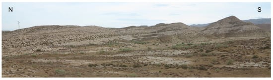 Panoramic view (N–S) of the studied area. The continuity of the gypsum banks can be observed with a gentle dip to the north.