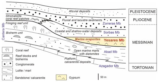 The stratigraphy of the Neogene Sorbas Basin, which comprises deposits from the middle Miocene to the Quaternary, is quite complex due to the variety of facies that exist, especially towards the basin rim [,]. The relationships between some of these lithological units have been frequently discussed, especially laterally, between the rim units and basin center [,]. For the Messinian, towards the center of the basin where the gypsum under study was deposited, four units can be clearly recognized, the order of which from bottom to top (Figure 3) is the following: The Abad Member of the Turre Fm and the Yesares, Sorbas, and Zorreras members of the Caños Formation [,].