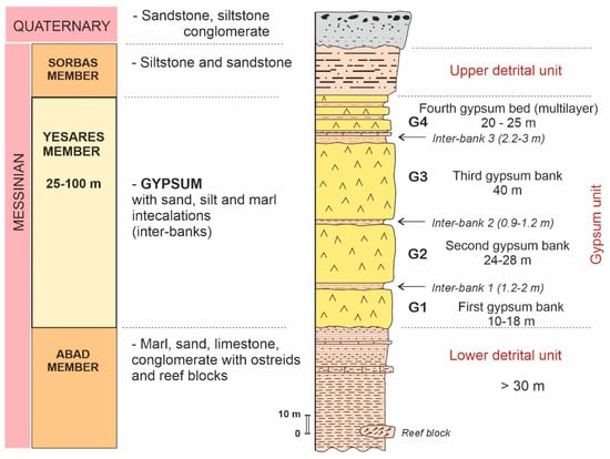 Stratigraphy of the study area, where four banks (G1, G2, G3, and G4) are differentiated within the gypsum unit (Yesares Member) separated by three detrital beds, mainly of fine sand, which are denominated as inter-banks.