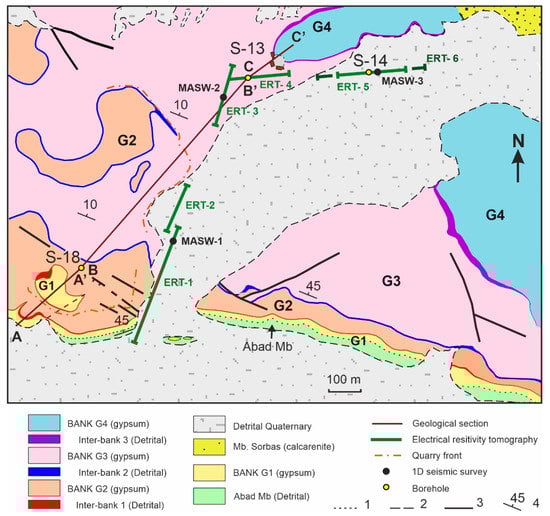 Geological map of the studied area (E sector). The position of the geological sections (A–A’, B–B’. C–C’), ERT profiles, and MASW points are indicated. Legend: 1, stratigraphic contact; 2, unconformable contact; 3, fault; 4, strike and dip of beds.