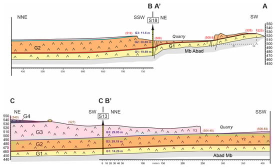 In the mapped area, the four gypsum banks outcrop, with a general dip towards the NNE of about 10° (Figure 5). The southern edge, where the gypsum disappears, is more uplifted by the thrust of Sierra Alhamilla, which is located further south (Figure 1). The levels that served to separate the banks are the inter-banks, which are beds from 1 to 2 m of sands and silts, although sometimes they outcrop in poor conditions. From the geological cartography, quarry cuts, and cores of some boreholes, it has been possible to make a geological section approximately from SSW to NNE, as shown in Figure 6. On the outcrops, faults and fractures in gypsum are not very visible; however, in the quarry cuts, some very fractured and broken zones can be identified, especially on the southern edge.