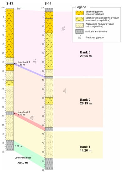 In the present study, we used core information from two boreholes (S13 and S14) provided by Saint-Gobain Placo Ibérica S.A. (Figure 9). In these cores, packages 1, 2, and 3 of gypsum can be identified in both boreholes S13 and S14. The gypsum lithofacies that appear are selenite, locally with alabastrine gypsum, in the G3 bank. The G2 bank consists of alabastrine nodular gypsum and some selenite crystals. Additionally, in both the boreholes S-13 and S-14, the G1 bank is composed of alabastrine nodular gypsum.