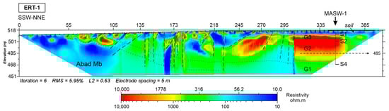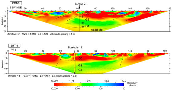 The ERT-3 and ETR-4 profiles are almost perpendicular and located where borehole 13 was drilled (Figure 9 and Figure 12). According to the cores of borehole 13, the bottom of the gypsum unit (G1, G2, and G3) can be located at about a 65 m depth (ERT-4). With the help of the MASW-2 seismic test, it is possible to determine the depth where the boundaries of gypsum bank G2 reach in ERT-3. Its resistivity distribution is similar vertically: the highest resistivities occur in the upper part (>5000 ohm.m, bank G3) and at about 40 m there is a band of lower resistivity (500–700 ohm.m) that would include the G2 and G1 banks.