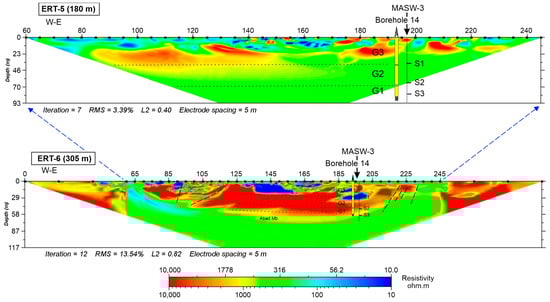 In the longer 305 m profile (ERT- 6), there is an anomaly of lower resistivity east of borehole 14, which could be explained by the different behavior of this low-resistivity zone due to the passage of the test current at a greater depth, which helped facilitate or find new paths in the low-resistivity zone. This passage of the current at a greater depth also produces a better visualization of what the gypsum unit (G1, G2, and G3 packages) would be, with resistivities close to 10,000 ohm.m in the central part of the profile. Therefore, the realization of these two profiles for the same section led to a better assessment of the results obtained around borehole 14, which has obviously helped in the interpretation of this section.