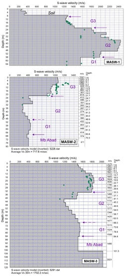 Figure 14. Three 1D seismic surveys (Multichannel Analysis of Surface Waves 1, 2, and 3) conducted on the ERT profile numbers 1, 4, and 5, respectively. - The MASW-2 seismic profile after an increase in velocity shows a decrease in propagation velocities from 22–40 m depth. From 40 m, there is an increase in velocity, attenuating from 66 m onward. In these velocity changes, the approximate depth of the detrital inter-banks can be determined, taking into account the thicknesses of the gypsum banks of borehole 13. In this case, the petrographic characteristics of gypsum bank 2 (G2) indicate a disturbance in the transmission of S-waves, since they present values below 700 m/s.