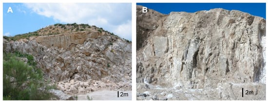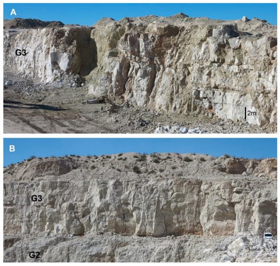 - The lower outcropping unit corresponds to the Abad Member, which consists of marls, locally with beds of diatoms, silts, and fine sands with some conglomeratic beds rich in ostreids. At some points, metric carbonate reef blocks formed by Porites were observed. Above this are the gypsum rocks that are exploited in this area (Yesares Member). The surface that separates the marls and silts from the gypsum is an irregular erosive surface, which can be related to the Messinian Mediterranean desiccation [,,,]. The existence of this erosional surface is important to consider because it may imply thickness variations in the gypsum banks, especially in the lower beds of the unit.