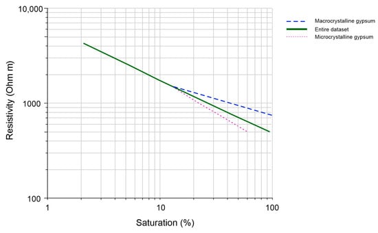The G3 bank is entirely formed by selenite, while the middle–lower parts of the G2 and G1 banks are formed by nodular gypsum of alabastrine type, with a matrix between its nodules (Figure 7 and Figure 9). Here, one could think of this phenomenon of percolation, according to which the matrix can affect the resistivity in areas where it is abundant. As soon as the matrix is important and, above all, an interconnection is developed between the casts, a current passage can be created that lowers the resistivity of the gypsum body []. Percolation theory, in the case studied, can be applied to nodular lower banks of gypsum with a shale matrix where there is a percolation threshold representing the minimum amount of shale necessary to obtain long-range connectivity []. Below the percolation threshold, the electric current does not find connectivity pathways in the matrix and passes through the sulfates [], leading to higher resistivity values for the whole gypsum bank. However, the lithofacies of the gypsum may vary laterally, and the gypsum of the studied unit does not have important matrix contents, in general, and for this reason other alternative or complementary factors can also be considered.