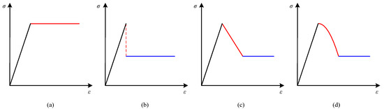 Different constitutive models. (a) elastic–perfectly plastic; (b) elastic–brittle-plastic; (c) linear strain-softening; (d) nonlinear strain-softening.