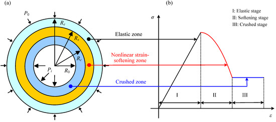 With the rapid development of society and the economy, many huge infrastructure projects have been put into construction. As one of the most common structures, tunnels are widely used in water conservancy engineering and underground traffic engineering [1,2,3]. The stress state in the underground rock will change after the excavation of tunnels [4,5]. Once the changed stress exceeds the ultimate strength of the rock mass, the tunnel surrounding the rock would be destroyed, and three different regions (a damaged region, a strain-softening region, and an elastic region) would be formed, which would exert a significant impact on the stability of the tunnel [6,7,8,9,10]. Therefore, accurate stress analysis of the surrounding rock is very important to the stability control of the tunnel.
