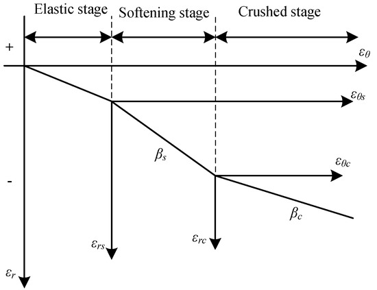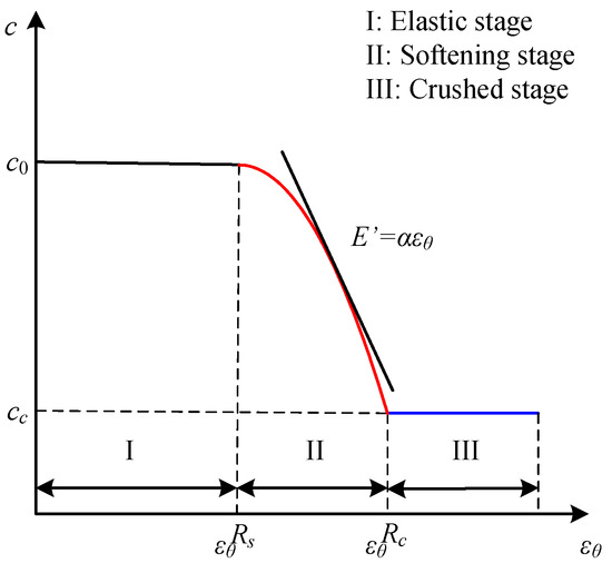 Generally, the cohesion in the strain-softening region decreases nonlinearly, and the softening modulus of cohesion increases with the increase in strain, as shown in Figure 3. We assume that the softening modulus of cohesion is as follows: