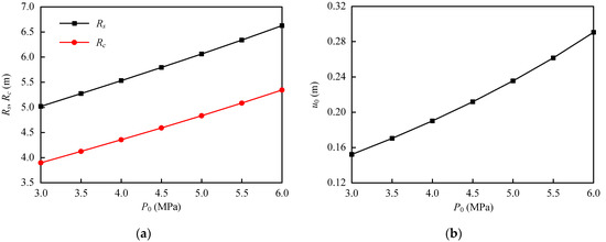 Figure 7 shows the effect of seepage force on the radii of strain-softening and crushed regions and surface displacement around the tunnel. It can be seen that the Rs, Rc, and u0 values all increase with the increasing P0. For example, as P0 increases from 3.0 MPa to 6.0 MPa, the Rs, Rc, and u0 increase by 1.61 m, 1.45 m, and 0.14 m, with an increment of 32.07%, 37.21%, and 91.98%, respectively. Therefore, the larger seepage force will aggravate the deformation of the tunnel.