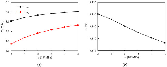The effect of softening modulus coefficient of cohesion on the radii of strain-softening and crushed regions and surface displacement around the tunnel is shown in Figure 9. It can be seen that the radii of strain-softening and crushed regions both increase with the increase in softening modulus coefficient. However, the ratio of the radii of the above two regions is getting smaller with the increasing softening modulus coefficient. For example, as α increases from 3 × 104 MPa to 8.0 × 104 MPa, the ratio of Rs to Rc decreases from 1.27 to 1.13, with a reduction of 11.02%. The surface displacement also decreases with the increase in softening modulus coefficient. For example, the surface displacement is 0.19 m when the softening modulus coefficient is 3 × 104 MPa, and surface displacement reduces to 0.18 m when the softening modulus coefficient reaches 8 × 104 MPa.