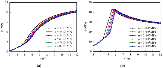 The radial and tangential stresses in the tunnel surrounding rock with different softening modulus coefficients of cohesion are shown in Figure 10. It can be seen that the tangential stress is always larger than the radial stress. As the distance from the tunnel center increases, the radial stress continues to increase, and the tangential stress first increases in the crushed and strain-softening regions and then decreases in the elastic region, which is similar to the laws in Figure 8. However, the radial and tangential stresses in the crushed region are very close under different softening modulus coefficients of cohesion. Additionally, as the softening modulus coefficient increases, the peak value of tangential stress does not change, which means the sensitivity of softening modulus coefficient to stress distribution is quite low.
