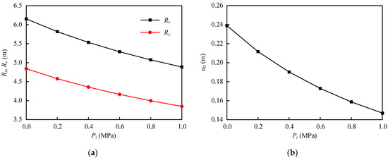 Figure 11 shows the effect of initial support resistance on the radii of strain-softening and crushed regions and surface displacement around the tunnel. It can be seen that the Rs, Rc, and u0 values all decrease with the increasing Pi. For example, as the Pi value increases from 0 to 1.0 MPa, the Rs, Rc, and u0 values decrease by 1.26 m, 0.99 m, and 0.09 m, with a reduction of 20.49%, 20.45%, and 38.51%, respectively. Therefore, the larger initial support resistance can control the deformation of the tunnel. As a result, some support measures, such as concrete lining and bolts, can be used to increase the initial support resistance and ensure the stability of the tunnel.