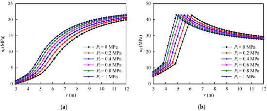 The radial and tangential stresses in the tunnel surrounding rock based on different initial support resistance are shown in Figure 12. It can be seen that with the increase in initial support resistance, the whole radial stress and the tangential stress in the crushed and strain-softening regions increases while the tangential stress in the elastic region decreases. However, the peak value of tangential stress remains constant as the initial support resistance changes.