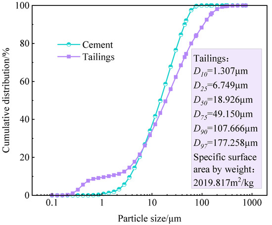 5–7 mm sized waste rock and gold tailings were utilized for making CTB samples. ordinary Portland cement (OPC) 42.5R was employed as a basic cementing source. Tap water in the lab was used as mixing water. A laser diffraction particle size analyzer was utilized to characterize specimens’ grain size distribution (GSD). GSD profiles of gold both tailings and cement are shown in Figure 1. Note that GSD plot of gold tailings was similar to that of cement. 10% of the tailings were less than 2 μm, and 50% of the tailings were less than 20 μm. The curvature coefficient of the tailings was 2.07, and the uniformity coefficient was 20.98.