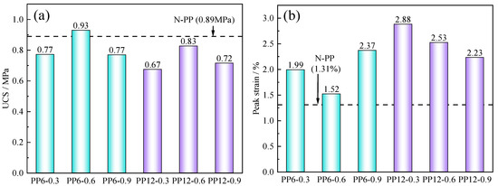 UCS and peak strain of FRCTWRF samples: (a) UCS; (b) peak strain. Cyan means PP6; purple means PP12.